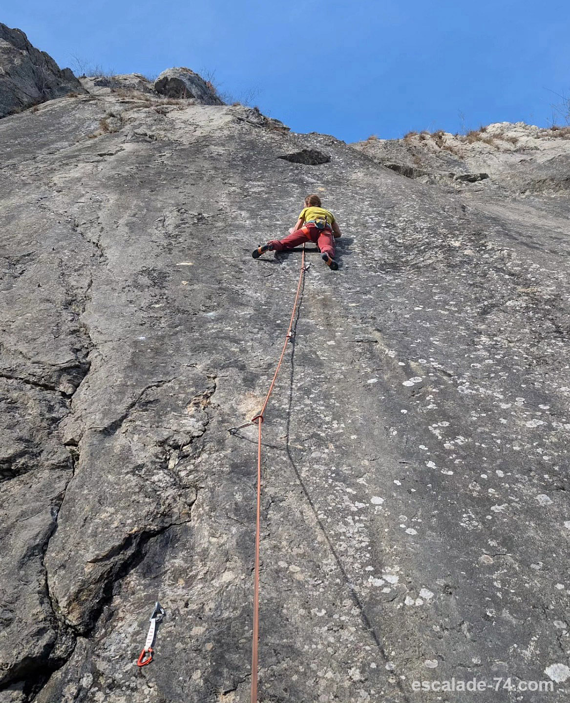 L’avis d’un grimpeur : Voilà un moment que je me dit qu’il faudrait aller jeter un coup d’œil à ce 8a, qui était dans les années 80 le premier 8a de France moins que vertical. Réalisée à vue par Alain Ghersen… chapeau ! Je n’ai pas trouvé des grimpeurs motivés pour ce style, je suis donc allée la voir seule, avec la perche , le Grigri, le Croll, la brosse… J’ai entendu dire que pas mal de prises ont cassé depuis, et que ce n’était pas sûr que ça passait toujours. J’ ai pris du temps à trouver, brosser et marquer les petites prises et encore plus petits pieds… et quand je trouve la méthode, je casse encore un réglette… bref c’est une voie évolutive. Mais ça passe toujours. L’escalade n’est pas de tout physique, on peut lâcher les mains plein de fois, mais c est très mental…un petit doute dans ton pied et t’es dans la corde. À faire…et à se faire léger pour ne pas casser les prises qui restent !
