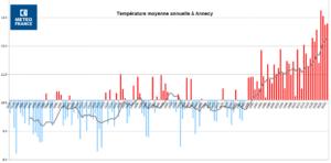 Température moyenne annuelle à Annecy de 1876 à 2025. En gris la moyenne sur 10 ans, qui a augmenté de 2,8°C environ depuis la fin du 19ième siècle, alors que la planète se réchauffait de 1,25°C. Dans les 10 dernières années, l’augmentation est de 0,9°C.
