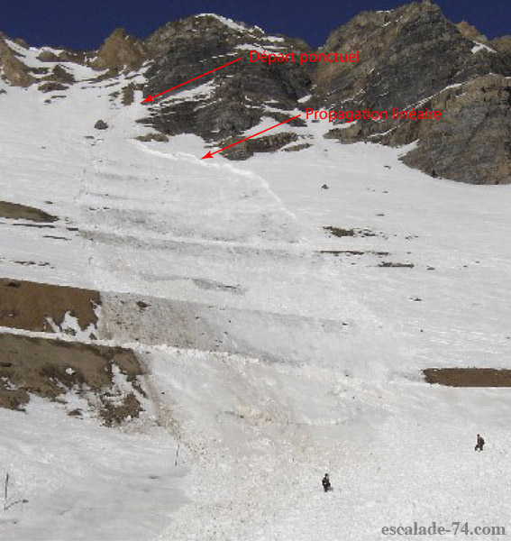 En général, les avalanches ont un départ ponctuel ou linéaire. Celle-ci possède les deux catégories, même si le départ initial est ponctuel. C'est la première coulée avalancheuse qui a provoqué en aval un départ linéaire.