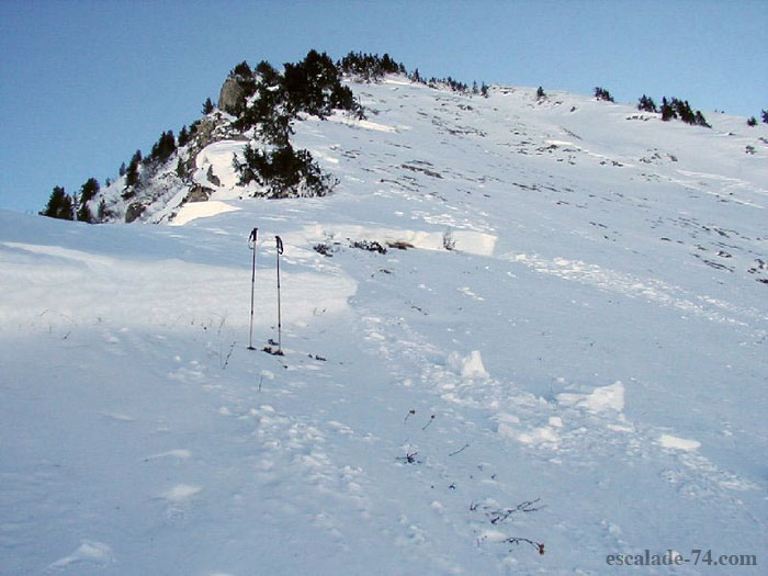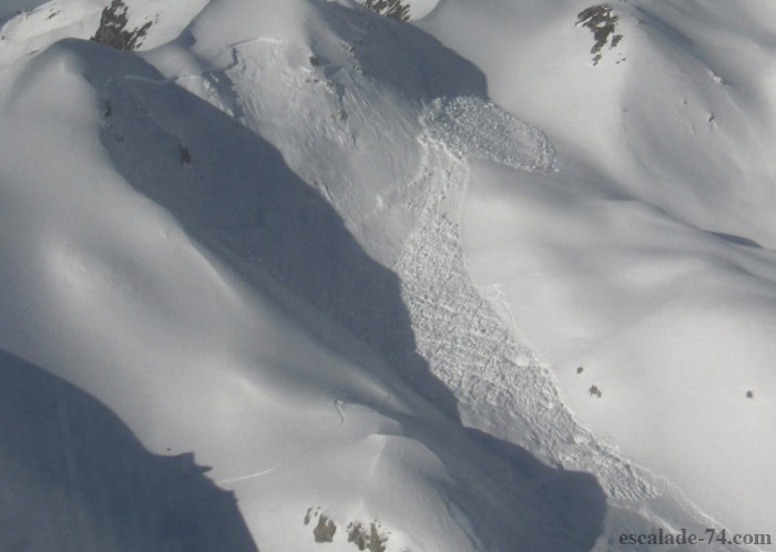 Sur cette photo, on voit en bas à gauche la trace de montée. Un skieur, en traversant la combe là où elle est peu raide, a déclenché à distance la pente raide située plusieurs dizaines de mètres en amont. Bien que cette pente raide soit de faible extension (quelques dizaines de mètres de dénivellation), elle a atteint en contrebas une zone assez éloignée, il a été emporté.