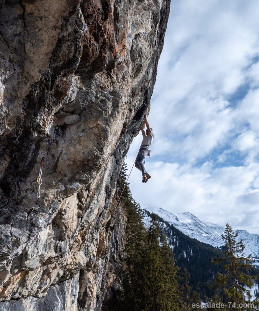 La toute première fois que j’y ai mis les mains je n’ai pas décollé et j’ai abdiqué rapidement. Quelques années plus tard, avec l’aide de Will, qui m’a donné ses méthodes, j’ai commencé à comprendre et aimer l’effort de cette voie: bloc, rési, intense. En effet, il faut forcer dès le départ en empilant de nombreux blocages, des mouvements dynamiques, un pseudo repos puis une superbe section rési à doigts. Tout ça en 15/20 m. Après ça tu peux commencer à y croire ! Mais il reste tout de même une belle section rési avec un jeté final ! Incroyable. Tu finis le reste de la voie dans une longue dalle noire bien typée Bionnassay, bien plus simple mais très bien pour savourer l’effort accompli jusqu’au relais de la délivrance. Tweety est une très belle voie à doigts
